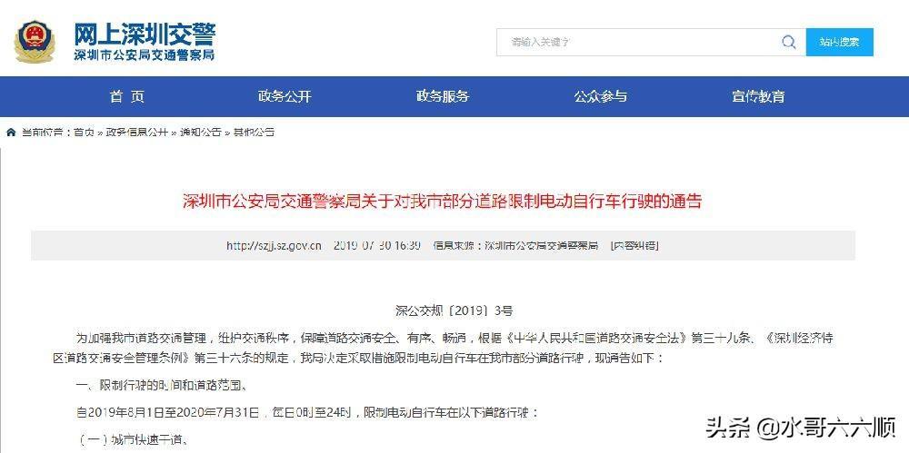 据深圳市公安局交通警察局消息,为加强深圳市道路交通管理,维护交通秩序,保障道路交通安全、有序、畅通,根据《中华人民共和国道路交通安全法》第三十九条、《深圳经济特区道路交通安全管理条例》第三十六条的规定,深圳市公安局交通警察局决定采取措施限制电动自行车在深圳市部分道路行驶,8月1日起执行。