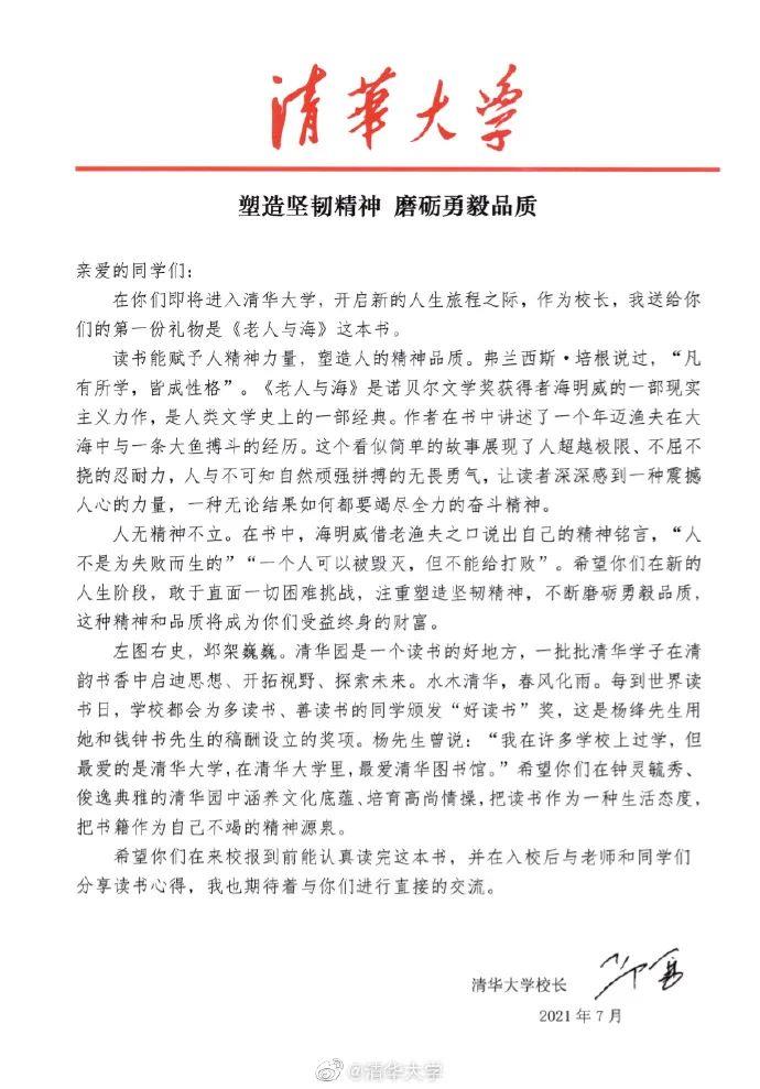 “亲爱的同学们,在你们即将进入清华大学,开启新的人生旅程之际,作为校长,我送给你们的第一份礼物是《老人与海》这本书。”