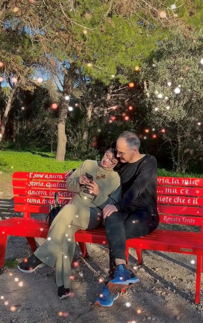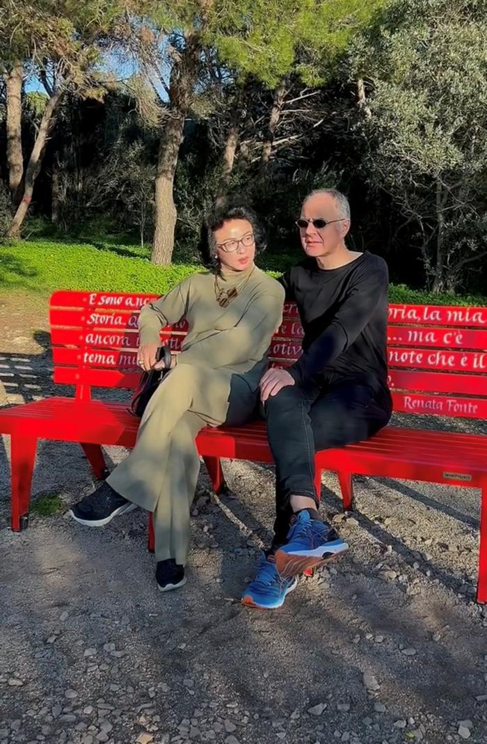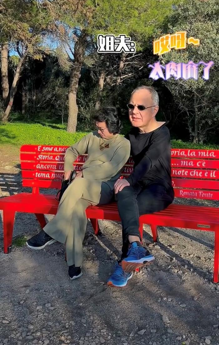 夫妻俩坐在公园的长椅上悠闲地晒着太阳,画面看起来特别温馨。