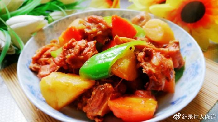 “大盘鸡中”整块鸡,整块菜,迎合了人们追求完美完善的祈愿。在这道美食中,虽然是肉菜的杂烩但肉保留了肉味,菜保留了菜味,味道之间不欺不没,各自保留了特色。