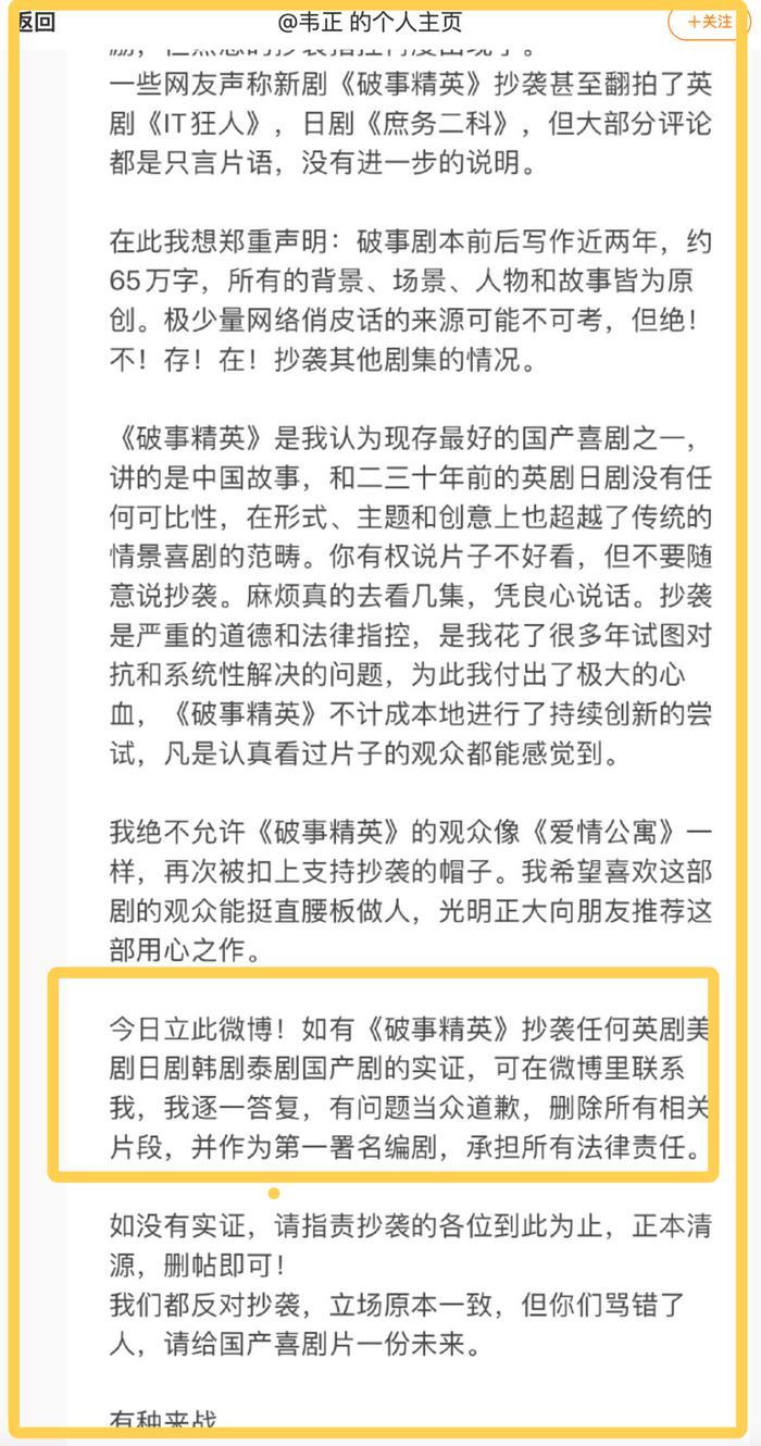 导演韦正,在社交媒体上发文回应,称《破事精英》完全是原创。
