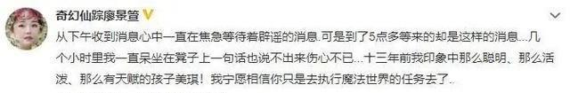 “魔仙小蓝”廖景萱:“从下午收到消息心中一直在焦急等待着辟谣的消息,可是到了5点多等来的确是这样的消息…几个小时里我一直呆坐在凳子上一句话也说不出来伤心不已…十三年前我印象中那么聪明、那么活泼、那么有天赋的孩子美琪!我宁愿相信你只是去执行魔法世界的任务去了…”