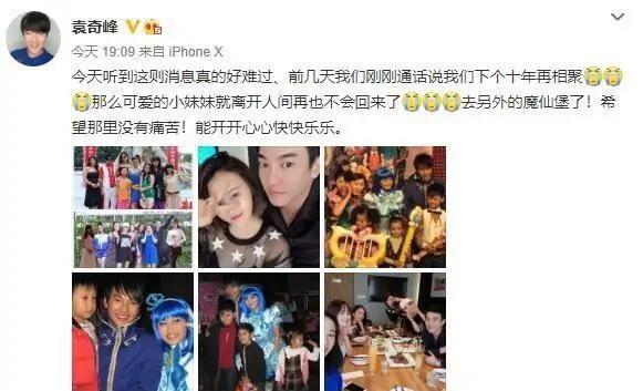 “游乐王子”袁奇峰:“今天听到这则消息真的很难过,前几天我们刚刚通话说我们下个十年再相聚,那么可爱的小妹妹就离开人间再也不会回来了,去另外的魔仙堡了!希望那里没有痛苦!能开开心心快快乐乐。”