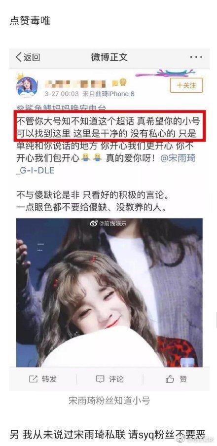 赖冠霖粉丝疑似扒出宋雨琦小号,据说关注了曾辱骂过队友内涵吴宣仪碰瓷提咖的粉丝,还点了黑粉的赞。有意思了,宋雨琦才因为跑男增加的话题度全变黑词条了,谁的锅