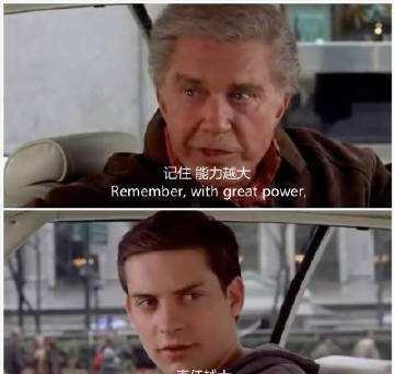 【3】“荷兰弟版蜘蛛侠”取消了一个“重要设定”——“能力越大,责任越大”:这句“座右铭”式的格言,几乎贯穿了“蜘蛛侠”的所有故事,而前两版蜘蛛侠更是将“梅姨父”为“蜘蛛侠”留下这句遗言的剧情作为“重头戏”。