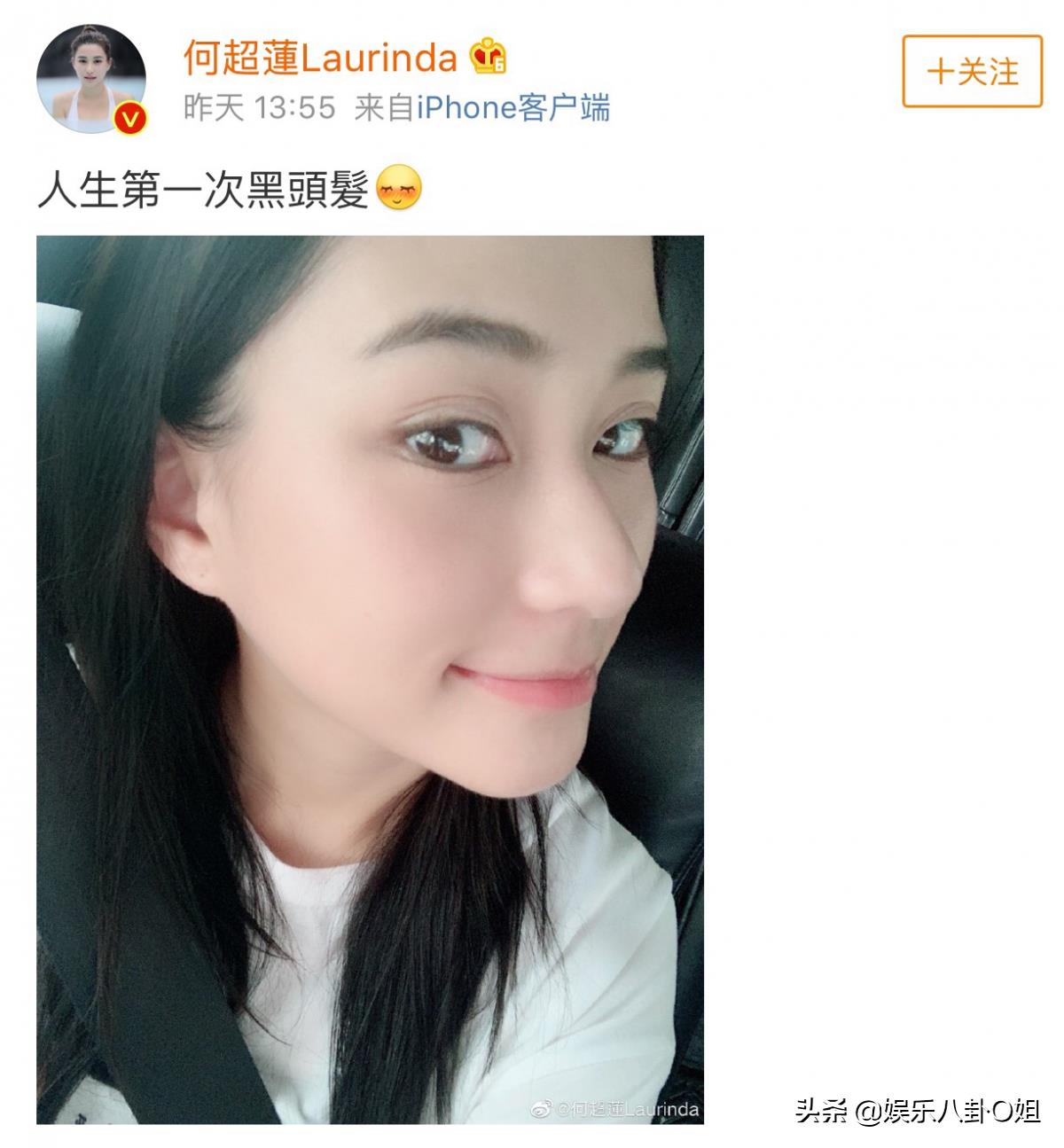 何超莲晒出一张黑头发的自拍,配文人生第一次黑头发。