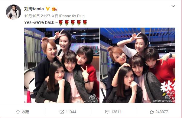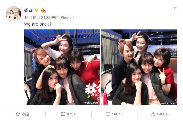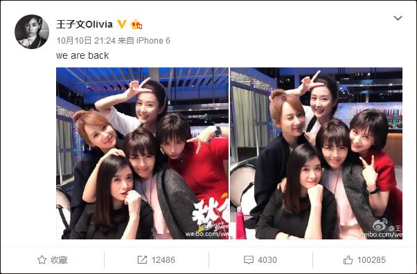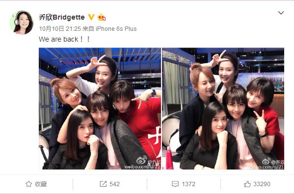 10月10日晚上九点二十几分,《欢乐颂》五美刘涛、蒋欣、王子文、杨紫、乔欣纷纷在微博晒出五人合影,并都配文“We are back”,宣布全员合体再聚《欢乐颂2》。