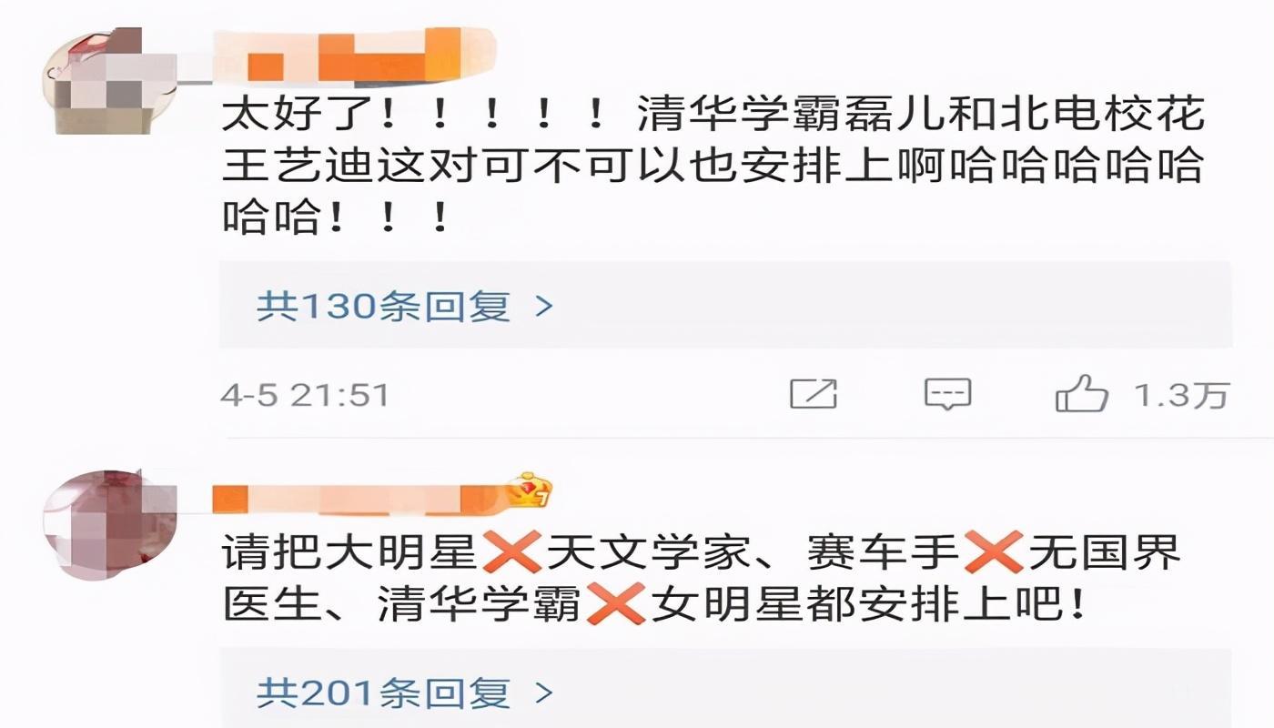 除了凡英cp,还有网友观众的清华学霸磊儿和北电校花王一迪,赛车手季杨杨和医生陶子,都是网友所关心的,想看到的。