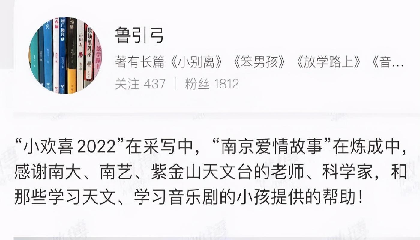 最近,《小欢喜》的编剧鲁引弓发文,“小欢喜”2022在采写中,并且感谢南京诸所高校的老师和科学家的帮助“,应该是为了“南京爱情故事”。
