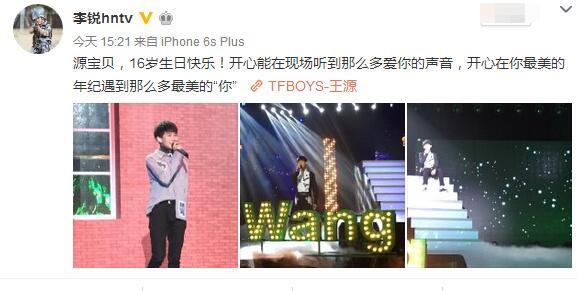 湖南卫视知名主持人李锐最近在《真正男子汉2》和《爸爸去哪儿4》的表现引发网友关注。今天,村长李锐居然出现在TFBOYS王源16岁的生日会直播现场,还在微博晒出现场照应援:源宝贝,16岁生日快乐!开心能在现场听到那么多爱你的声音,开心在你最美的年纪遇到那么多最美的“你”。