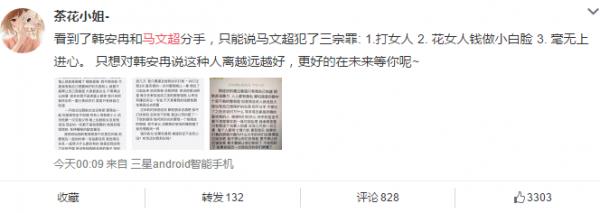 有网友表示:看到了韩安冉和马文超分手,只能说马文超犯了三宗罪: 1.打女人 2. 花女人钱做小白脸 3. 毫无上进心。 只想对韩安冉说这种人离越远越好,更好的在未来等你呢~