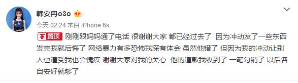 韩安冉今天凌晨发了一条微博:“刚刚跟妈妈通了电话 很谢谢大家 都已经过去了 因为冲动发了一些东西 发完我就后悔了 网络暴力有多恐怖我深有体会 虽然他错了 但因为我的冲动让别人也遭受我也会愧疚 谢谢大家对我的关心 他的道歉我收到了 一笔勾销了 以后各自安好就够了”