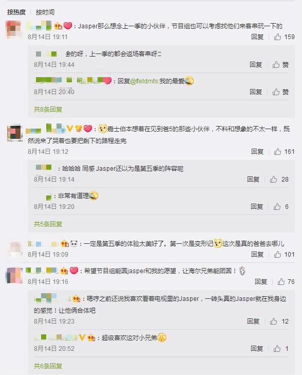 很多网友说Jasper之所以想参加《爸爸去哪儿》第六季,是因为想念第五季的伙伴们了,以为这一集也会是同样的小伙伴,没想到来到一看全是不认识的,和想象的不太一样,但是既然来了,哭着也要把剩下的路程走完。