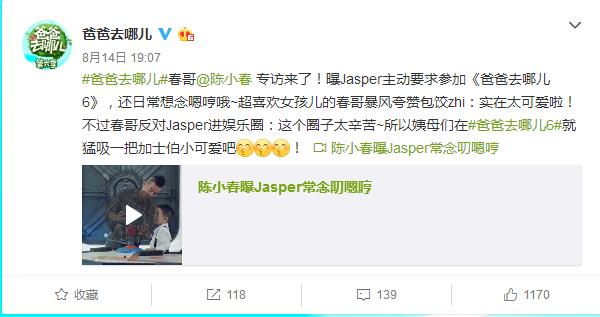 听说,Jasper这一次之所以会参加《爸爸去哪儿》第六季还是他自己想要参加的,陈小春曝光说,Jasper日常很想念嗯哼。对于这一次嗯哼没有参加,网友们表示都很失望,因为都想看他们两兄弟再次组合。