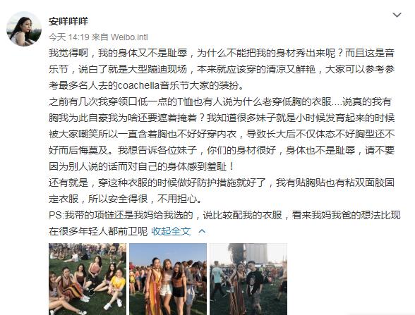 在黄安仪看来,音乐节就应该有音乐节的装扮,身体并不是耻辱,有完美的身材应该引以为傲而不是遮遮掩掩,只是穿着清凉的时候要注意做好防护措施。