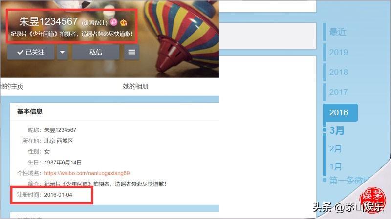 估计还真像朱昱自己所说,之前没有玩过微博,在第一条微博发出后,估计是收到了不少不太友好的声音,于是在第二条微博发出后,宣布“关闭评论”了。不过,查询她所用的微博发现,实际注册日期为2016年1月4日,而从右边的日期中看,这个微博曾在2016年1、2、3月都是有发过博文的,2017年6月、2018年6月以及2019年6月都是有过发文,只是后来清掉了。或许有可能是家人或朋友的微博借给她用的吧。