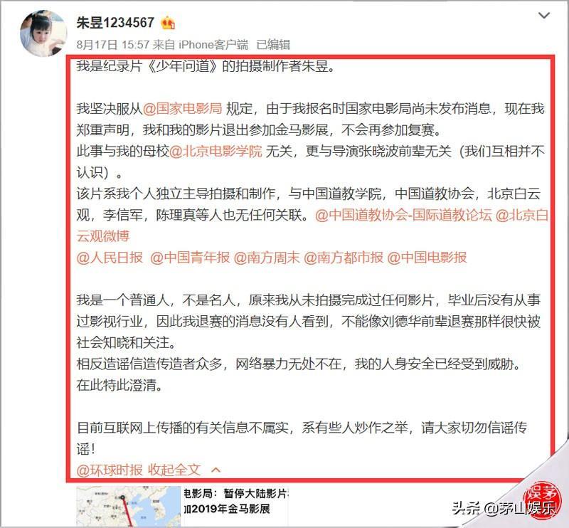 8月17日下午15:57分,纪录片《少年问道》导演朱昱发了一条长微博,称“坚决服从@国家电影局 规定,由于我报名时国家电影局尚未发布消息,现在我郑重声明,我和我的影片退出参加金马影展,不会再参加复赛。”她还表示,此事与北京电影学院无关,否认认识导演张晓波,影片是她独立主导拍摄和制作。此外,她还表示“人身安全已经受到威胁。”“目前互联网上传播的有关信息不属实,系有些人炒作之举,请大家切勿信谣传谣!”