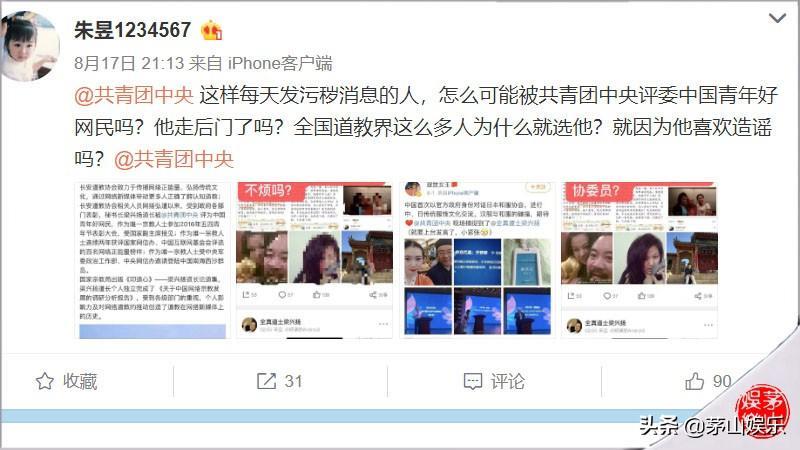 在她的微博下,有很多网友表示不接受这个解释,甚至有网友问道“村子里刚通网呢???玩儿呢”不过,朱昱并没有理会网友,很快又于17日的20:43分、21:13分、21:23分、21:44分、以及18日02:04分,连续发了5条微博怒斥大V全真道士梁兴扬造谣,还称其“想出名想出疯了吧?”,另外她还@共青团中央问道:“这样每天发污秽消息的人,怎么可能被共青团中央评委中国青年好网民吗?他走后门了吗?”