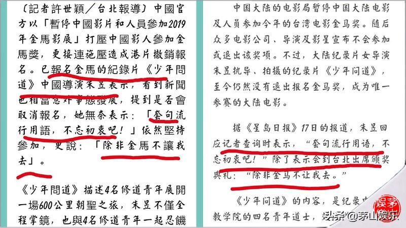 8月15日,多家台媒发通稿称,大陆纪录片女导演朱昱执导、拍摄的纪录片《少年问道》,至今仍然没有退出报名金马奖,成为唯一参赛的大陆电影。报道中还称朱昱对台媒记者表示:“套用流行用语,不忘初衷吧!”除了表示会到台北出席颁奖典礼:“除非金马不让我去。”此前还曾有内地媒体报道过朱昱曾公开发愿表示:“如《少年问道》幸运提名金马,她将率演员来台与台湾电影界及道教界进行交流,未来更希望来台拍摄相关题材。”