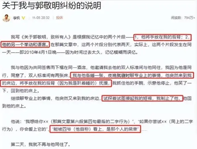 这次指郭敬明性骚扰的李枫没有给郭敬明任何体面,李枫表示事情在六年前他就已经说过,但当时郭敬明通过手段将事情压了下去。李枫现在再次出来指控只是希望不要有更多的人被郭敬明所欺骗了,他也完完整整的讲述了和郭敬明之间发生的一切。