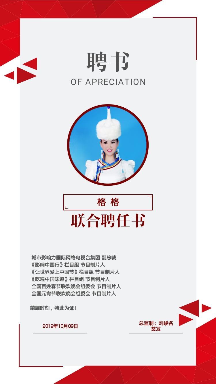 城市影响力国际网络电视台 北京讯(财经频道总编辑苏航报道)2019年10月9日,内蒙古著名歌手格格出任城市影响力国际网络电视台集团副总裁兼任《让世界爱上中国节》栏目节目组制片人。