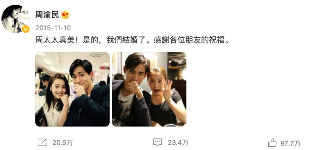 没记错的话,这就是周渝民当初官宣结婚的照片,周渝民已经放弃更新的微博滑一下就能看到,