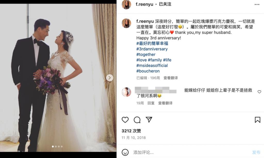 老婆喻虹渊的账号上也不见仔仔的身影,最多最多就是一家三口的倒影,连婚纱照都藏了整整 3 年才曝光。