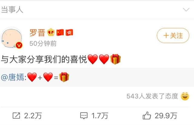 唐嫣通过个人账号发布了一条非常含蓄的微博,罗晋随后即转发并发文“与大家分享我们的喜悦”显然是公开宣布二人已经有了爱情的结晶。