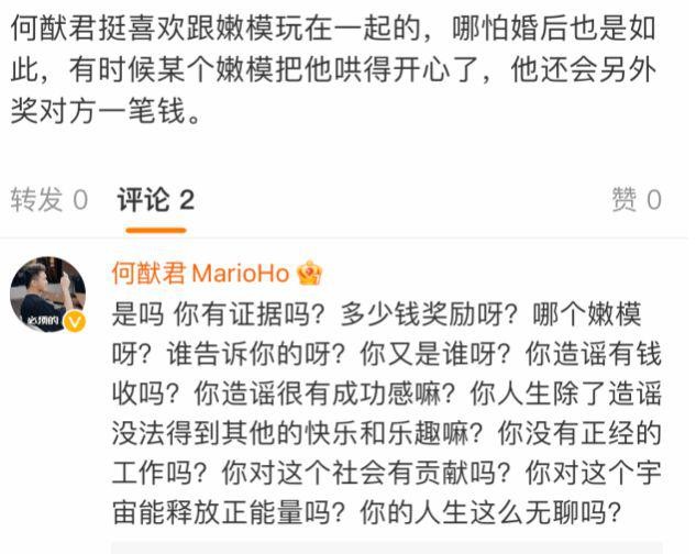 此前也有八卦博主爆料何猷君喜欢和嫩模玩在一起,婚后也是如此,更直言如果某个嫩模把他哄开心了,他还会另外奖励对方一笔钱。但随后何猷君立刻亲自出面辟谣。