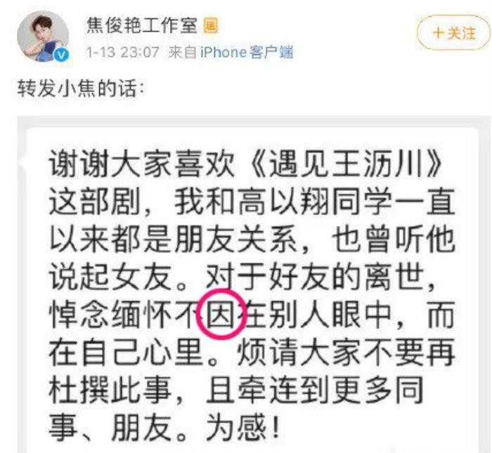 文中有1个错别字看到没?就是我们用括号圈起来的那个“因”字。此处不是应该要用“应”字吗?yin和ying,少了一个g字面上的意思也相差甚远。如果不是有意为之,那么就是焦俊艳写错别字了。这样一个声明肯定是有专人审查,实在不应该犯这样低级的错误才对。或许这也是焦俊艳用自己的方式来悼念高以翔。