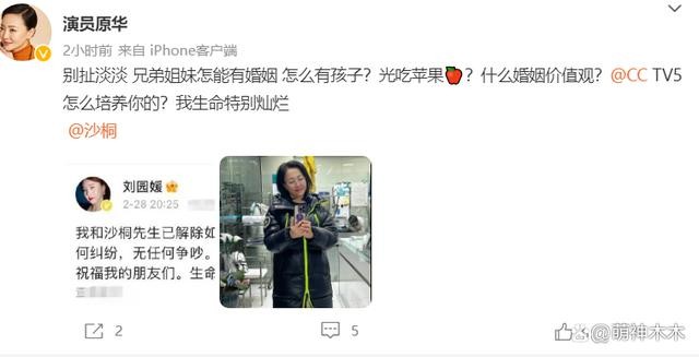 刘园媛的发文也引起了沙桐第一任妻子原华的注意,在互联网上鲜少发布动态的原华,在刘园媛官宣离婚后,贴出了刘园媛的发文截图,让她不要扯淡,随后连发三个反问句,抒发自己内心的困惑。