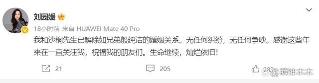 3 月刚开始就有一个大瓜,演员刘园媛官宣与央视主持人沙桐离婚,在发文中她提到,两人是和平解除婚姻关系,没有任何纠纷,最后还以一句抒情作为结尾:生命继续,灿烂依旧。