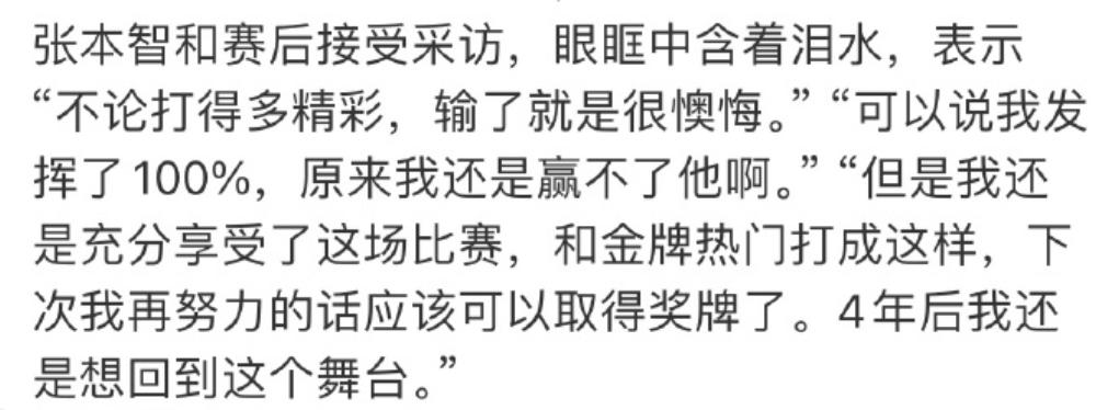 在比赛结束后,张本智和接受日媒采访时说,他已经发挥了 100%,原来还是赢不了他啊。