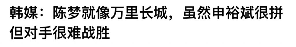 但陈梦同样实力强劲,她在 4 比 0 战胜韩国的申裕斌后,韩国媒体将她形容为 " 万里长城 ",原话是——