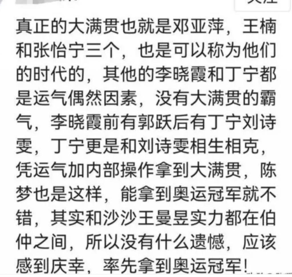 虽然之后李晓霞和丁宁都拿到了大满贯,但其影响力都远不如前辈。有球迷曾评价说真正的大满贯也就是邓亚萍,王楠和张怡宁三个,其他的李晓霞和丁宁都是运气偶然因素,没有大满贯的霸气。