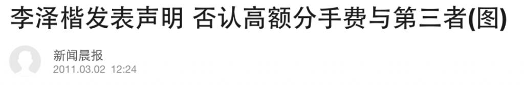 传闻她当时拿到了天价分手费,但李泽楷方曾发声明表示:" 所有提及数以亿计的所谓‘分手费’的报道亦纯属杜撰,硬要将我们那段感情与金钱挂钩,其居心叵测。"