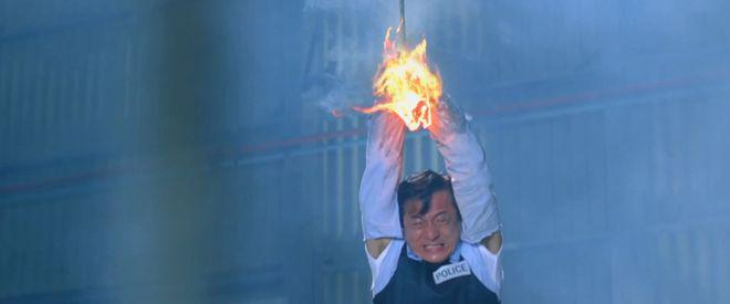徒手抓被点燃的绳子时,可是真抓啊,还在猛烈爆破中推人前行,更抓着手铐下楼。而在抓捕尹子维饰演的火爆时,成龙更是又如《警察故事 2》一样,站在了失控的公交车车顶,在各种障碍中穿梭,还飞身踢进玻璃窗户之中,都极为危险。