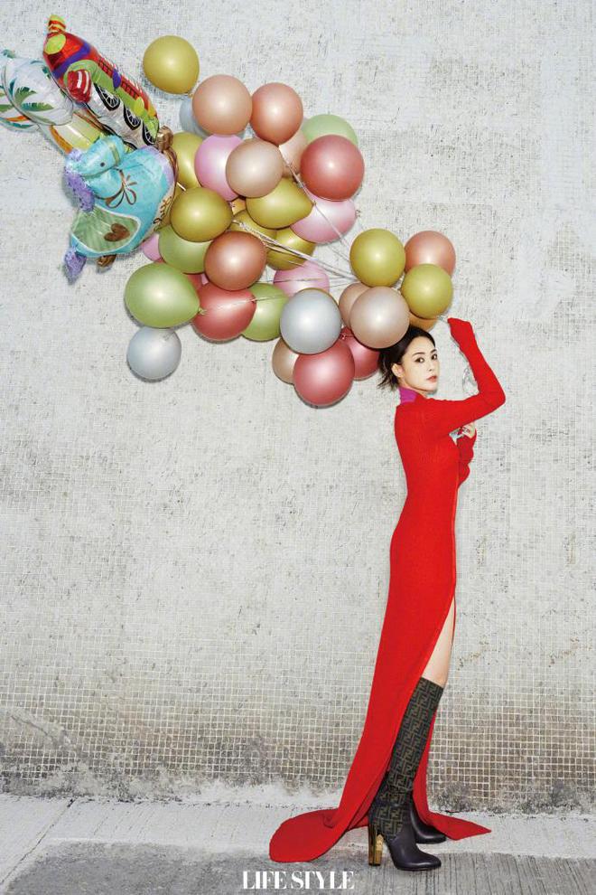 阿娇穿着红色开叉连衣裙,手拿气球,如同一团火,又靓又辣。
