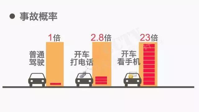 研究数据显示,司机边开车边看手机,发生车祸的概率是正常驾驶的23倍;打电话发生车祸的概率是正常驾驶的2.8倍,司机的反应时间比正常情况慢35%!竟然比酒后驾车反应时间20%还慢!