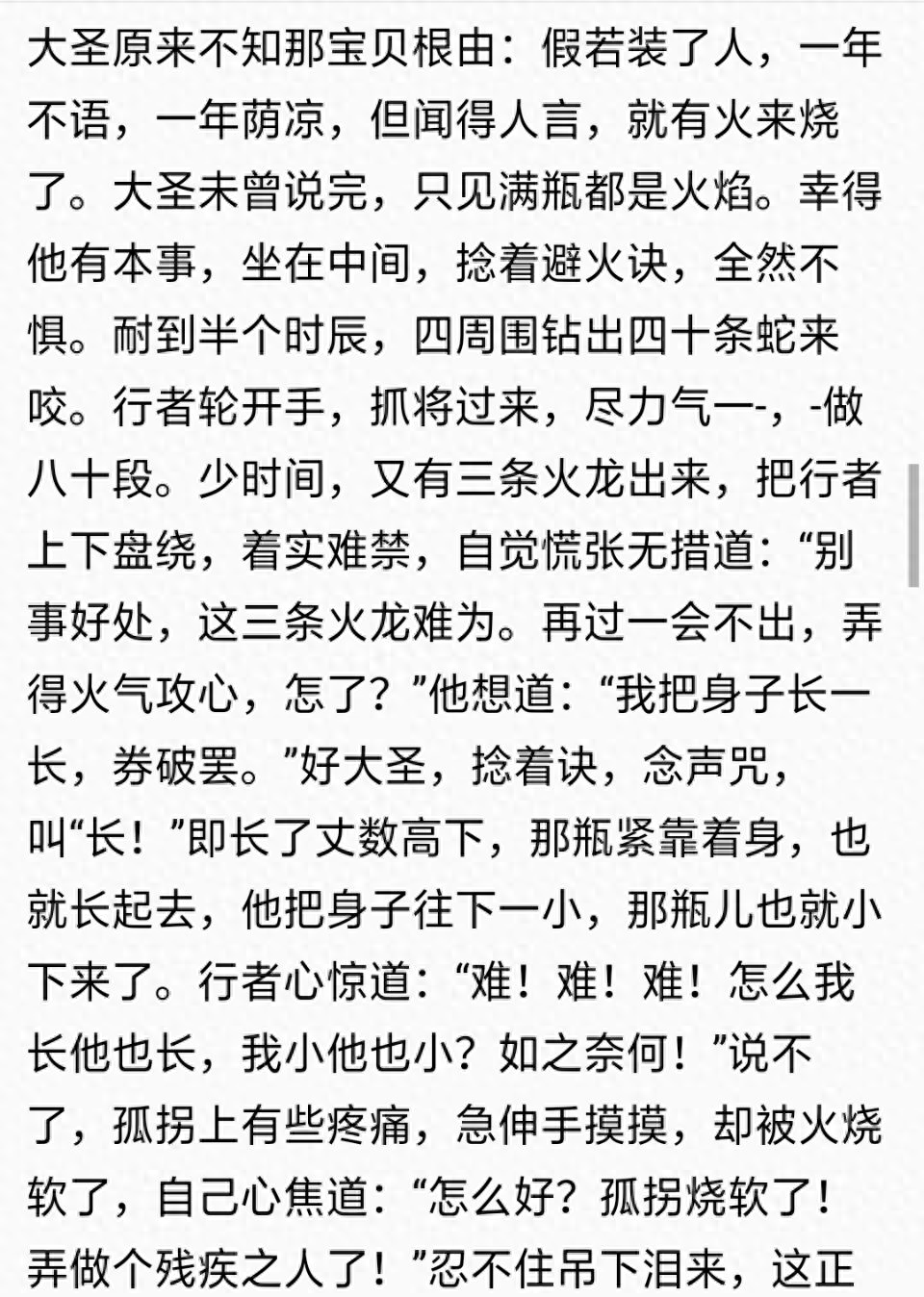 光是看到这样的描写就甚是吓人,孙悟空一开始被大鹏精的瓶子装了时不知根由,后来在瓶中被三条火龙折磨的以为要命尽于此,吓得悲伤落泪