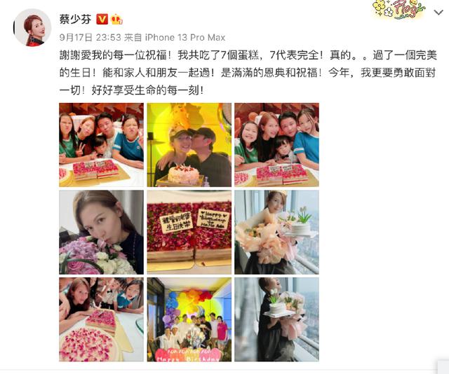 新浪娱乐讯 9 月 17 日,蔡少芬在微博晒出自己 49 岁庆生照,一家五口亲密合影。微博中,蔡少芬配文表示今年生日一共吃了 7 个蛋糕:" 能和家人和朋友一起過!是满满的恩典和祝福!"