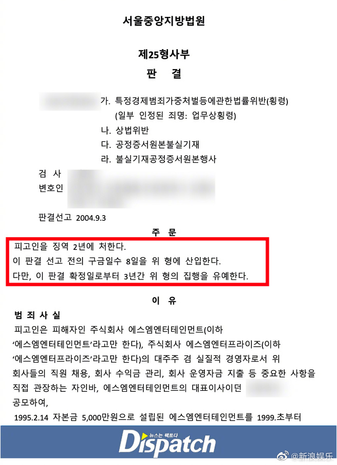 同时D社曝光称,李秀满2003年1月被国际刑警通缉,他5月自愿回国受到检方调查,被判2年监禁、3年缓刑。