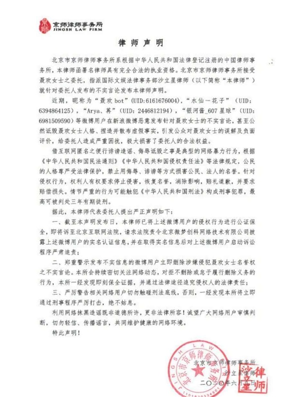 面对着这样的情况,一向温柔的聂欢也无法忍受,正式发布了律师声明来捍卫自己的权益。