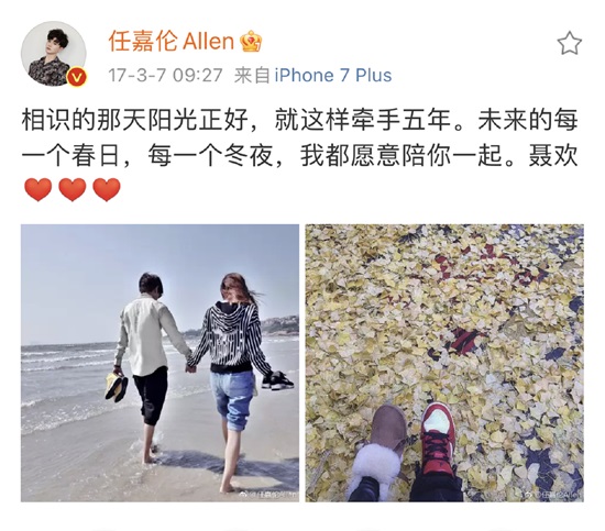 他写道:相识的那天阳光正好,就这样牵手五年。未来的每一个春日,每一个冬夜,我都愿意陪你一起。