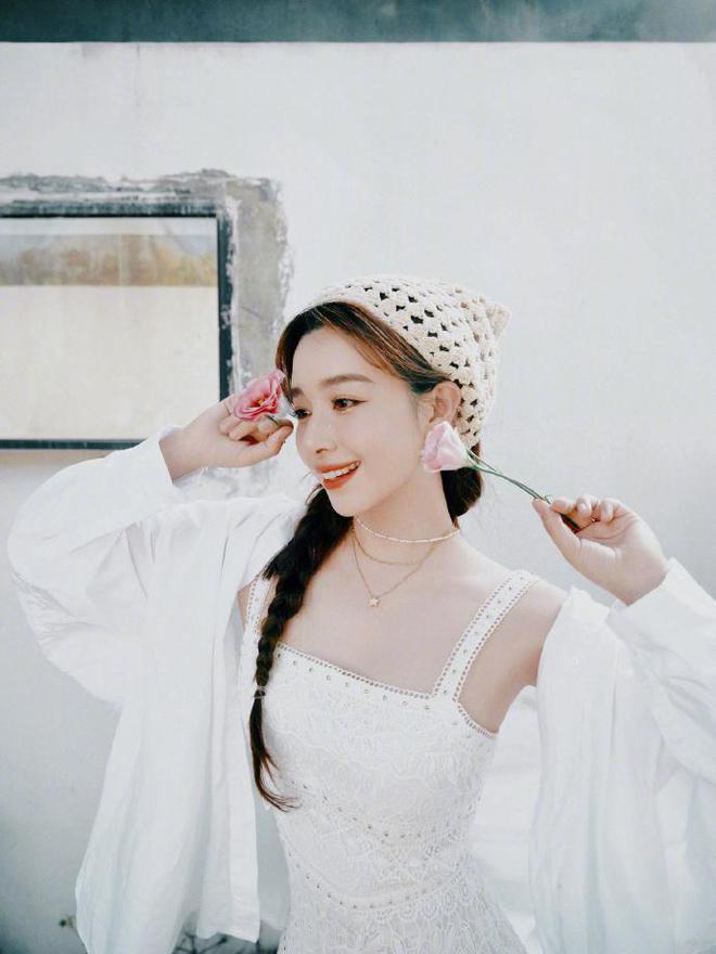 画面中的阚清子也穿着白色的蕾丝边吊带连衣裙,扎着麻花辫,而头上也系着白色的头巾,这造型看上去也依旧显得特别的甜美迷人了,整个人更是散发着青春与活力,简直美得让人舍不得移开眼了。