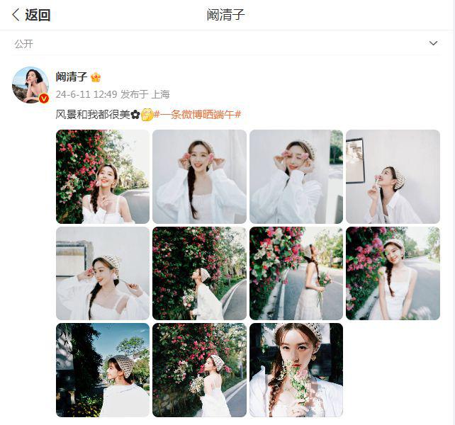6 月 11 日,作为景甜、某爽的大学同学的阚清子,也在个人的社交平台上分享了一组美照,并且特别自信的表示:" 风景和我都很美 ",虽然端午节已经过去了,但是她也依旧带上了与其相关的话题了。