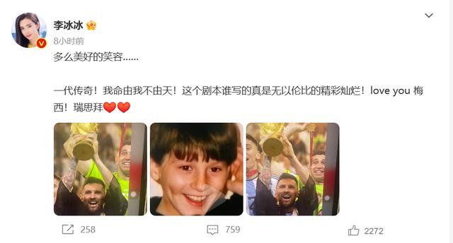 想必很多人关注昨天的总决赛,在梅西夺冠以后,众明星也送来了祝福。李冰冰在社交平台上发文说:“多么美好的笑容……一代传奇!我命由我不由天!这个剧本谁写的真是无以伦比的精彩灿烂!love you 梅西!瑞思拜”,看来也是很支持梅西了。