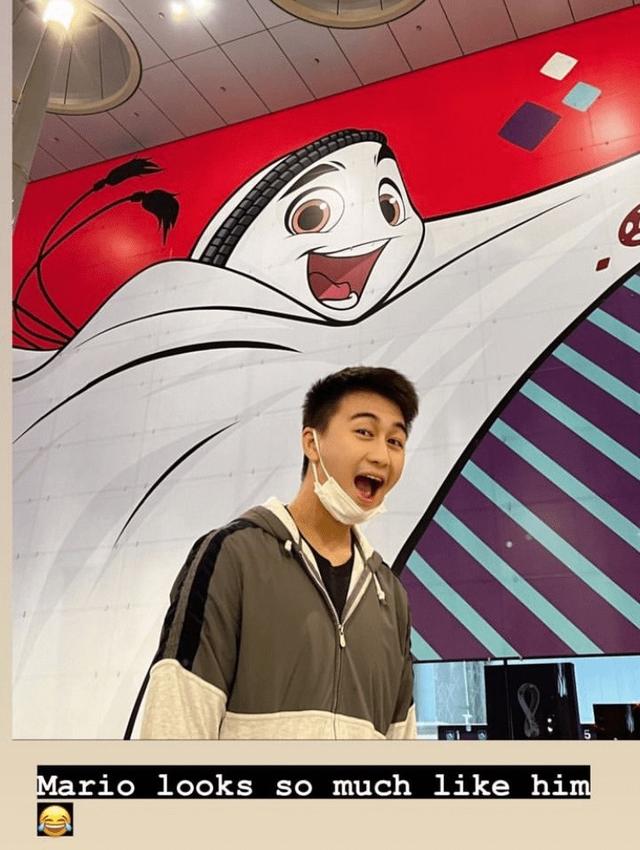 照片中一家人十分开心,想来对总决赛也是很关注。在奚梦瑶拍摄的照片中,何猷君穿着灰色运动衣,非常应景,一身衣服非常休闲。他正张着嘴模仿着背后的卡塔尔世界杯吉祥物“饺子皮”,两人的画风十分相似,看得出来何猷君玩得很开心。
