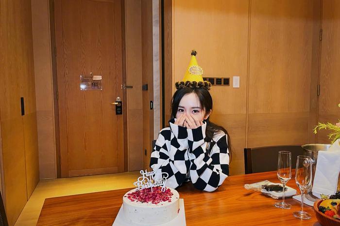 9月12日,杨幂在社交平台上晒出了自己的庆生照,照片中,杨幂穿着黑白格子长袖,头上戴着生日帽,前面摆着一个小蛋糕。双手捂着脸,眼神看向远方,皮肤白皙细腻,看不出来已经35岁了。