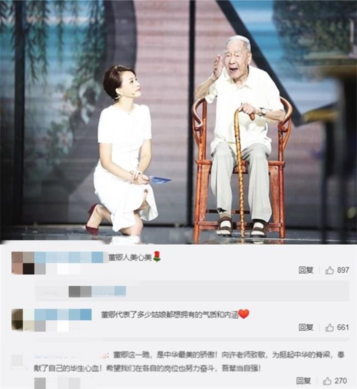 在《开学第一课》中短短三分钟内,董卿三跪许渊冲老先生,充分显示了她作为主持的所内含的气质内涵和对他人的尊重,这一行为受到不少网友的赞同和赞美,夸她人美心善,更有网友评论她这“最美一跪“,是中华最美的骄傲!